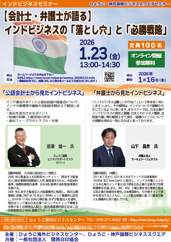 ひょうご・神戸国際ビジネススクエア(ひょうご海外ビジネスセンター、神戸市海外ビジネスセンター、JETRO神戸)は、『【会計士・弁護士が語る】インドビジネスの「落とし穴」と「必勝戦略」』と題し下記の通りオンラインセミナーを開催します。