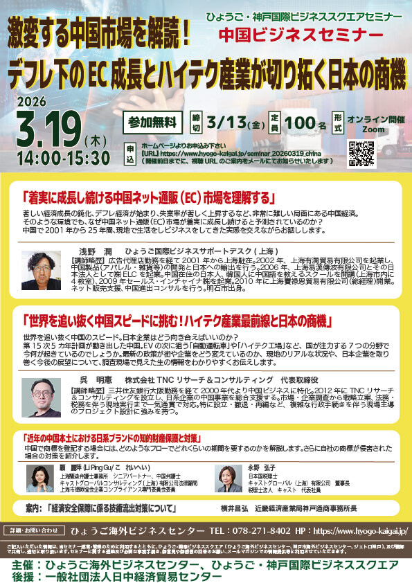 ひょうご・神戸国際ビジネススクエア(ひょうご海外ビジネスセンター、神戸市海外ビジネスセンター、JETRO神戸)は、「激変する中国市場を解読!デフレ下のEC成長とハイテク産業が切り拓く日本の商機」と題し下記の通りオンラインセミナーを開催します。